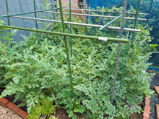 植え付け一の下に溝を掘り、堆肥と化成肥料を入れてから土を埋め戻しマルチをはりました。