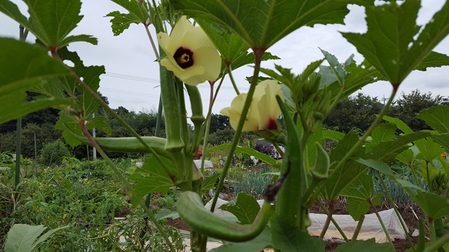 オクラオクラの多本仕立て栽培の様子です。背丈が180センチくらいになりました。