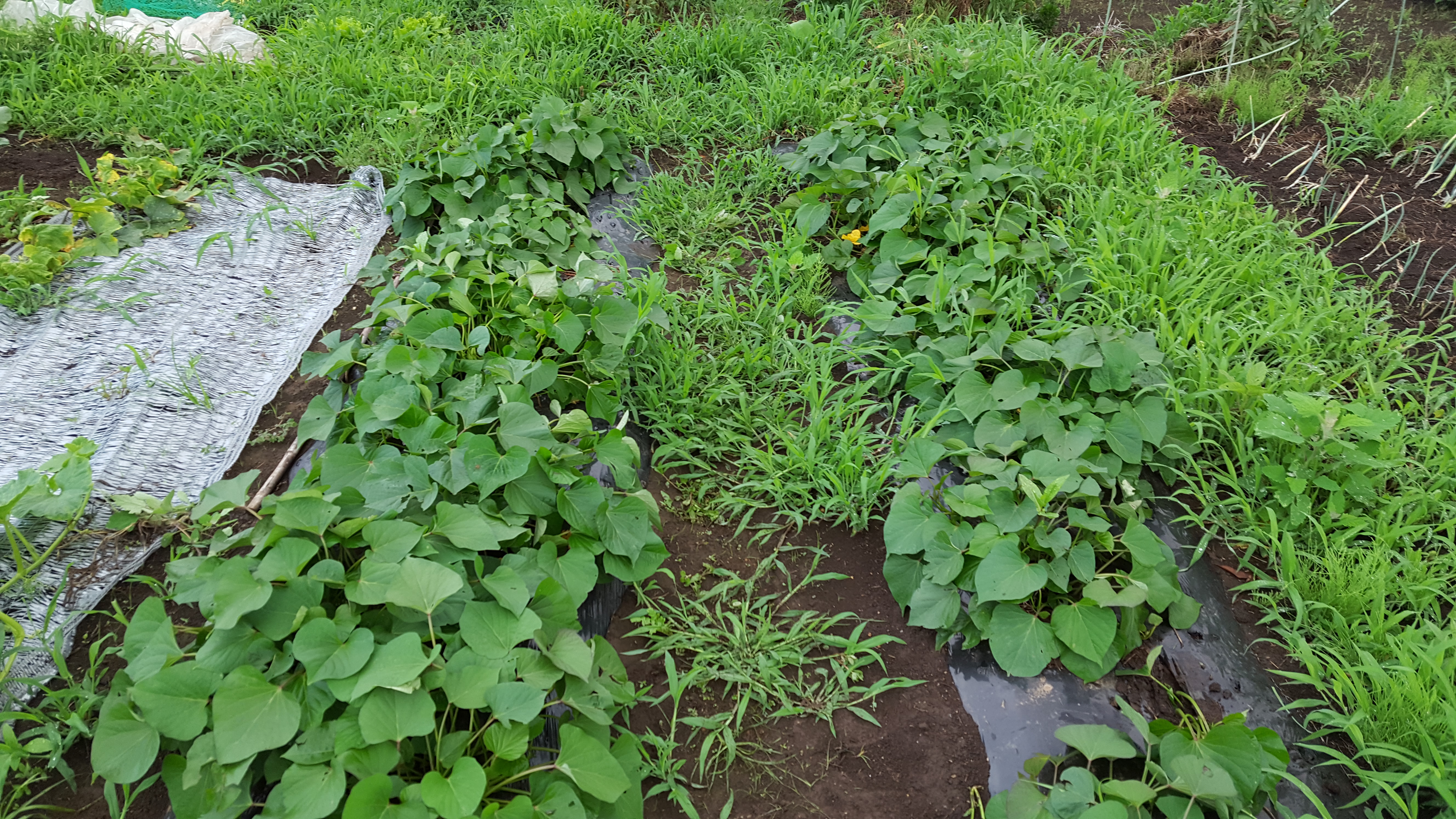 サツマイモがそろそろ収穫時期なので、雨が降り出す前に収穫しました。