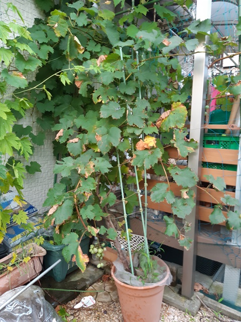鉢栽培のブドウの巨峰に、防虫、防鳥対策に果樹用のブドウ袋をかけてみました。