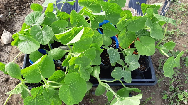 空中栽培用のネットを張っていますが、上の方の葉だけ元気です。