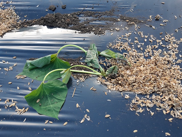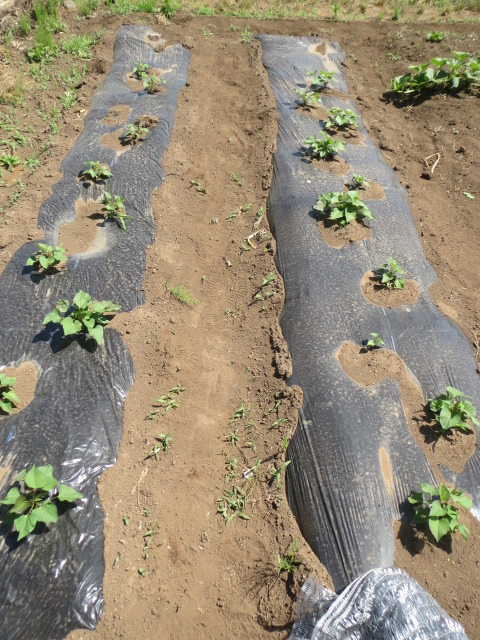マルチをはったあとに5センチくらいの深さに溝を掘って水平植えで植えつけました。