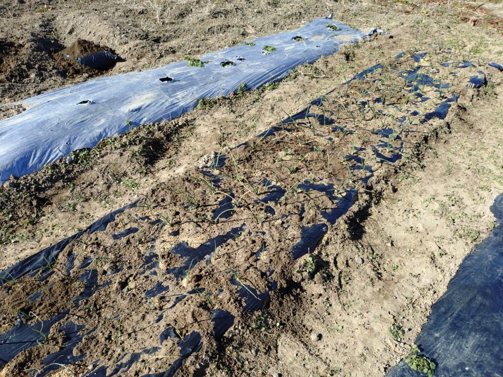霜で土が浮かないようにもみ殻をかけて、さらに風でマルチが浮かないように土を載せておきました。